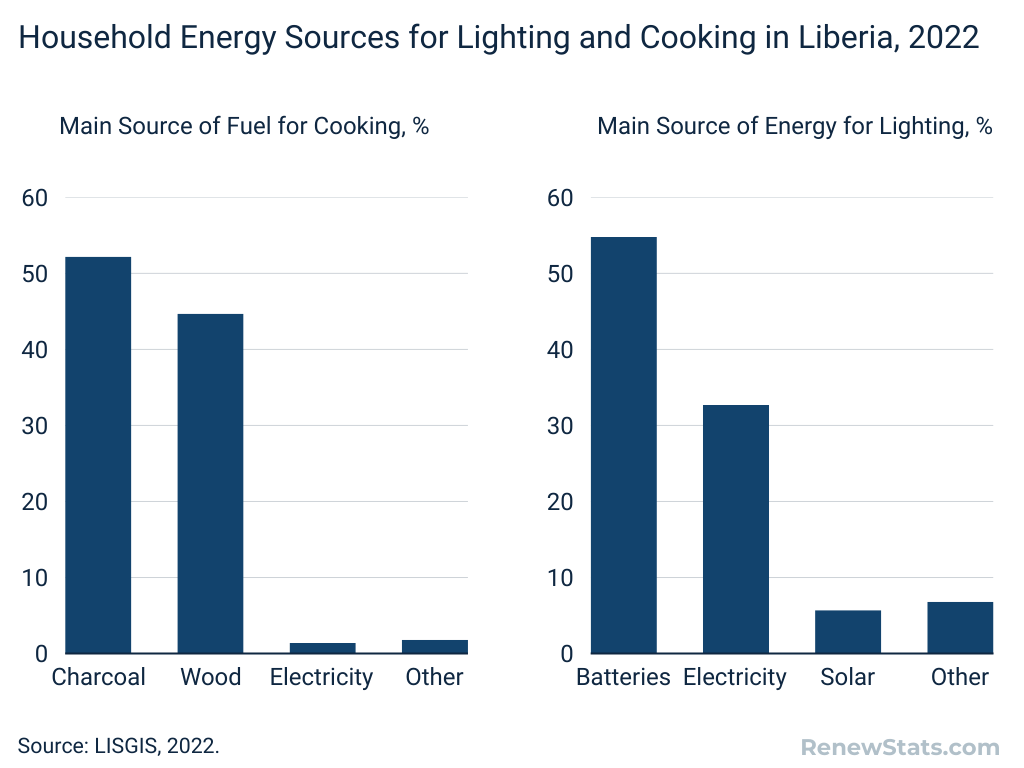 Cite Chart: RenewStats.com. (2025). Household Energy Sources for Lighting and Cooking in Liberia, 2022. Retrieved from https://renewstats:com/region/africa/2025/02/21/household-energy-sources-for-lighting-and-cooking-in-liberia/