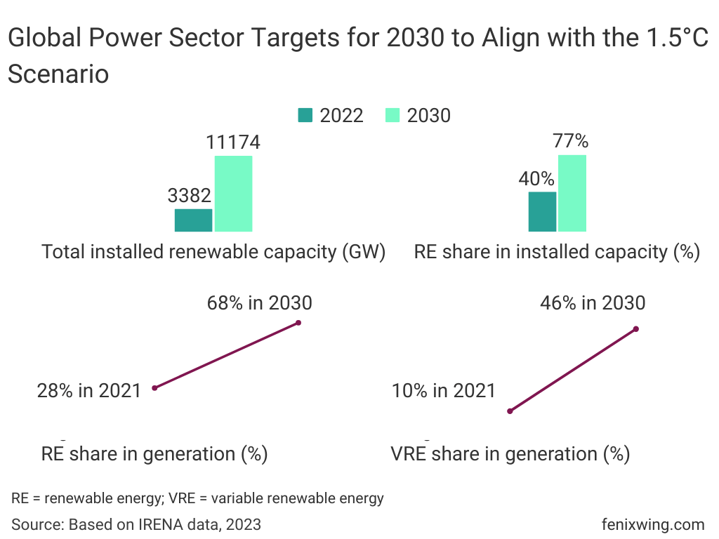 Global Power Targets 2030: Visualizing Ambitious Projections Aligned with the 1.5°C Scenario Explore the projections for the global power sector in 2030, aligned with the 1.5°C scenario. The figures showcase global targets based on IRENA’s 1.5°C Scenario for 2030, illustrating recent progress and the ambitious goals set for the power sector. The increasing share of renewable energy highlights a significant shift towards sustainable practices.