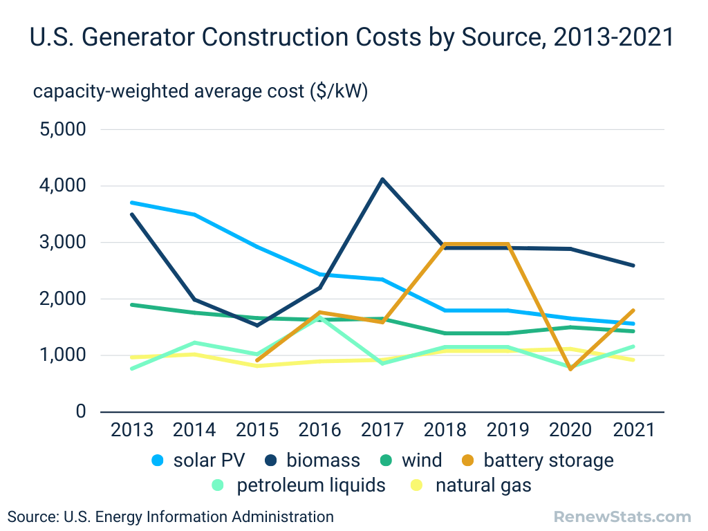 Cite Chart: RenewStats.com. (2024). U.S. Generator Construction Costs by Source, 2013-2021. Retrieved from https://renewstats.com/region/united-states/2024/07/11/us-generator-construction-costs-source/