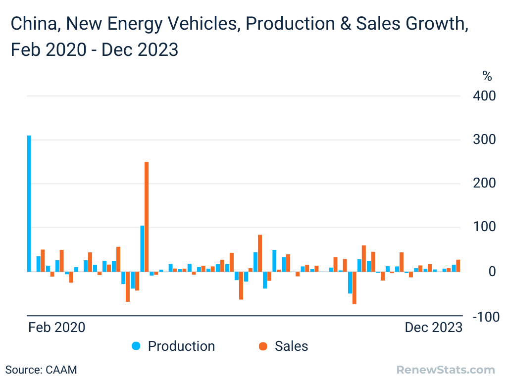 Cite Chart: RenewStats.com. (2024). China, New Energy Vehicles, Production & Sales Growth, Feb 2020 – Dec 2023. Retrieved from https://renewstats.com/chart-type/trend/2024/06/25/china-new-energy-vehicles-production-sales-growth/
